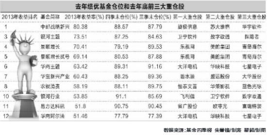 截至今日,去年收益超50%的最牛12只偏股基金中已有10只公布了2013年四季度报告,这些去年的赢家在震荡市中的仓位和调仓换股情况曝光。
